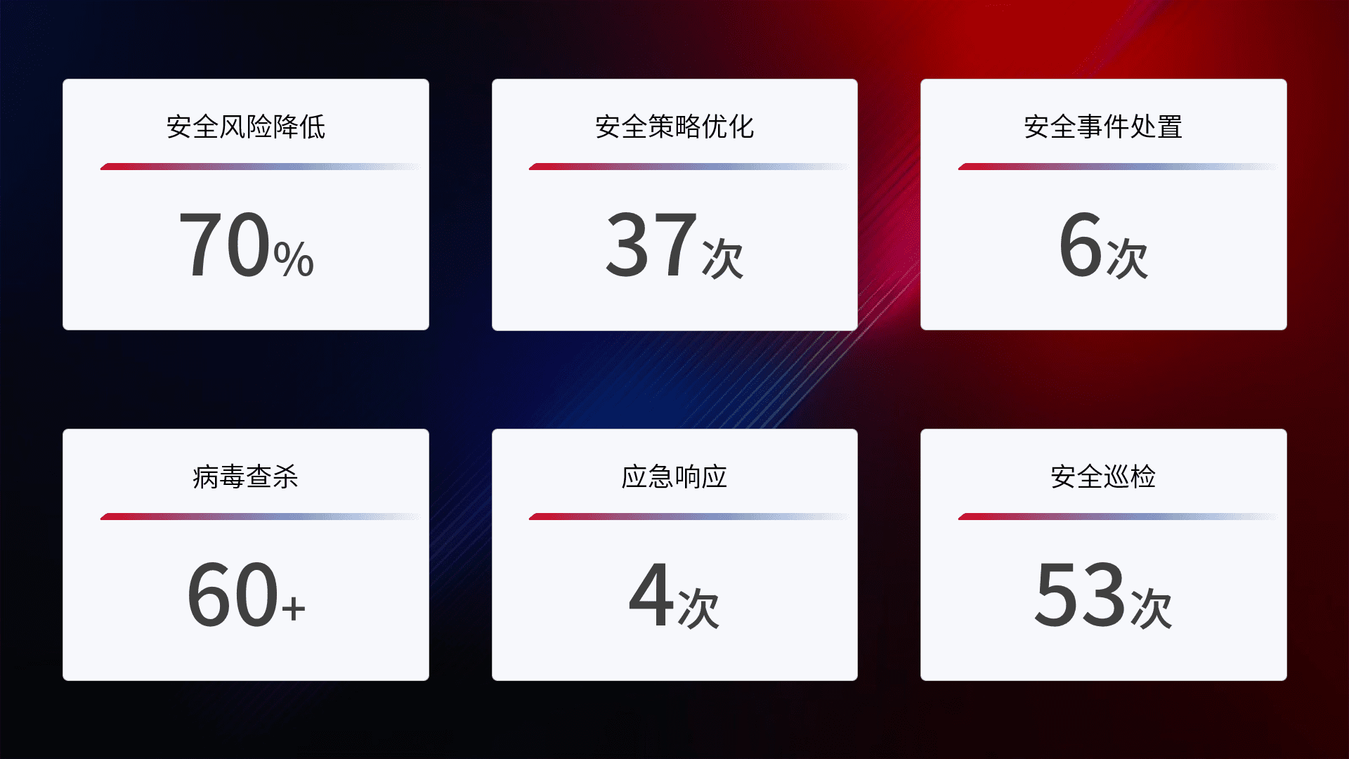 提供全面的安全事件报告体系,,包括处置报告、、、周报、、季度和年度总结,,结合持续监控,,,帮助客户深入了解网络安全状况。。。